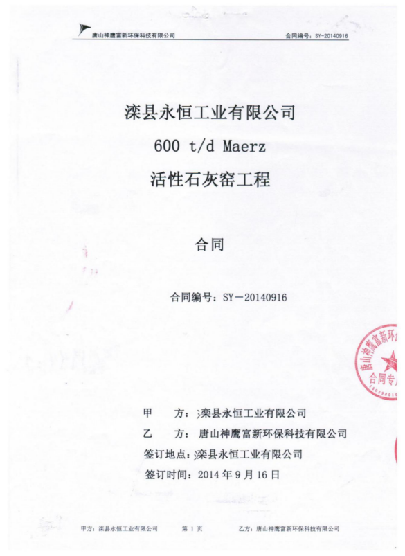 唐山永恒工業(yè)有限公司1x600t/d煤粉燃料雙膛豎窯工程設(shè)計、關(guān)鍵設(shè)備供貨、自動化控制系統(tǒng)供貨、電氣安裝以及窯爐安裝指導(dǎo)等